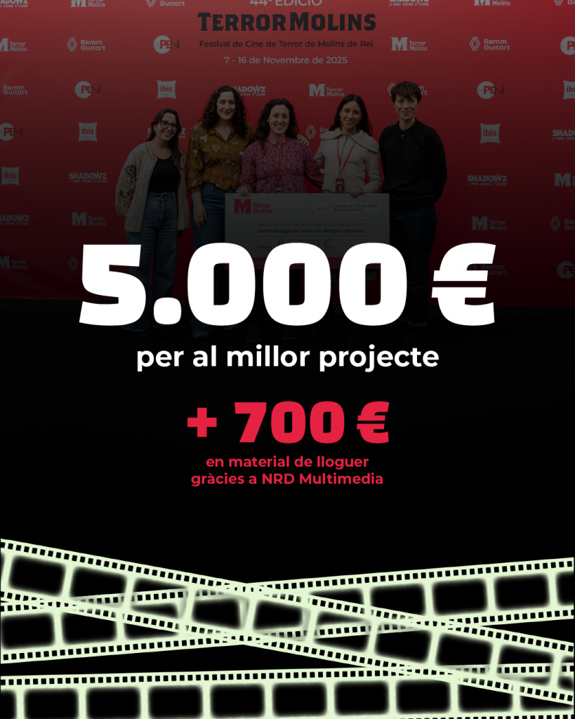 El projecte guanyador rebrà un premi de 5.000 € en metàl·lic i, com a novetat d’aquesta edició, també sumarà una aportació de 700 € en material de lloguer gràcies a la col·laboració de NRD Multimedia. A més, els projectes seleccionats tindran l’oportunitat de presentar-se en el marc de TerrorMolins, un dels festivals de terror més veterans i emblemàtics del circuit europeu.